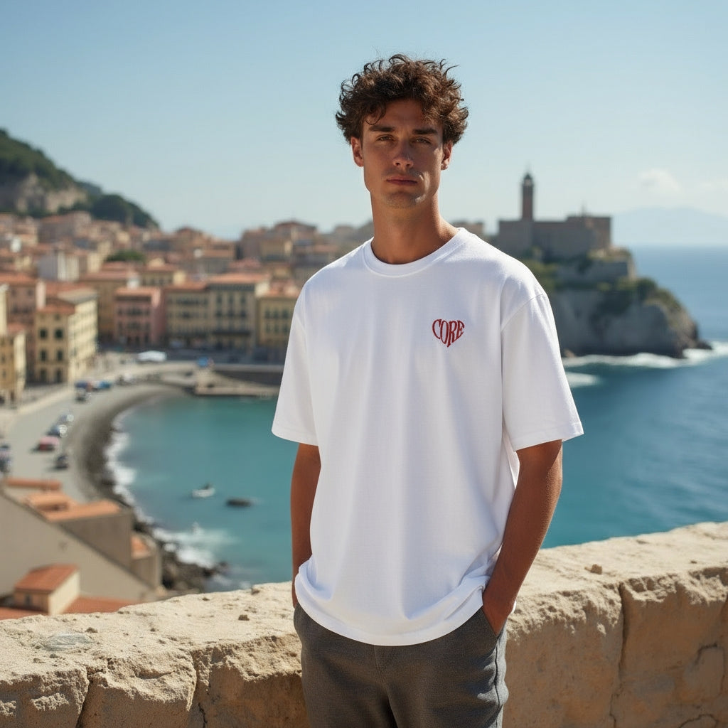 CORE nasce da una mancanza. Quella di un posto dove il sentimento potesse camminare per strada senza vergognarsi. Un brand che non urla, ma parla chiaro: amore crudo, vissuto, vero. Niente maschere, solo cuore cucito su stoffa. Per chi non ha paura di mostrarsi per ciò che è.